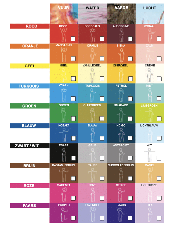 De Persoonlijke Kracht Methode combineert inzichten uit de psychologie van kleur met de vier elementen: water, lucht, vuur en aarde. Door deze elementen te koppelen aan de 10 kleurfamilies, ontstaan 40 unieke powertypes, elk met specifieke eigenschappen, sterktes en valkuilen.